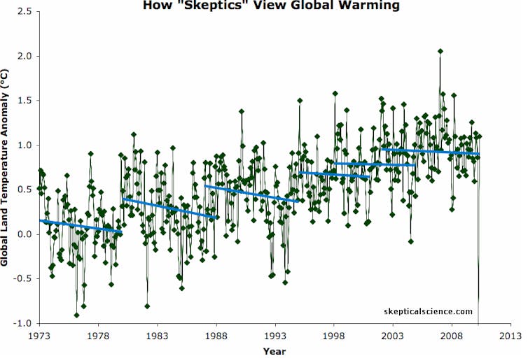 Consider the above graph showing two interpretations of global warming data, for instance. Or fluoride – in small amounts it is one of the most effective preventative medicines in history, but the positive effect disappears entirely if one only ever considers toxic quantities of fluoride.