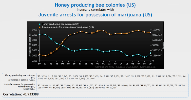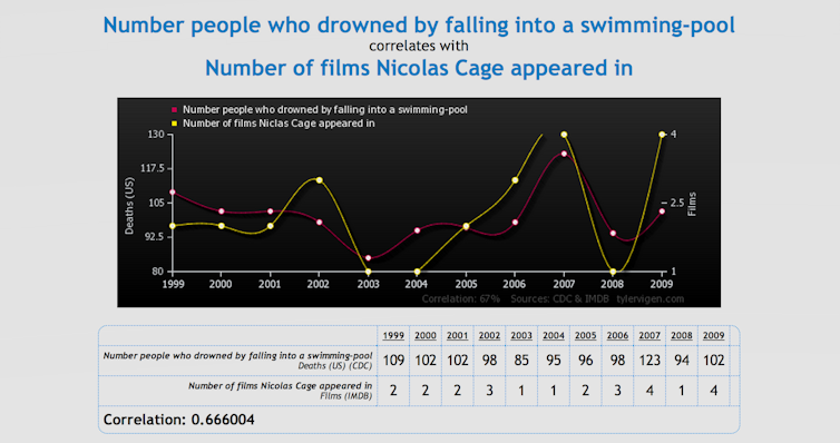 If two quantities are correlated then there might well be a genuine cause-and-effect relationship (such as rainfall levels and umbrella sales), but maybe other variables are driving both (such as pirate numbers and global warming), or perhaps it’s just coincidence (such as US cheese consumption and strangulations-by-bedsheet).